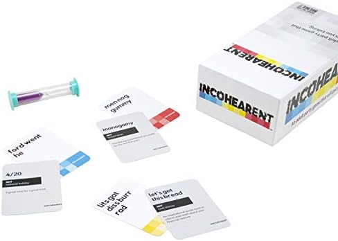 Incohearent is the party game by What Do You Meme? that will get you talking! Let the laughs begin as you compete to make sense out of gibberish from pop-culture categories. Each card has a combination of words on the front that, when recited out loud, sound like the phrase written on the back. For example, try reciting “thirds teeth or stay” out loud. Can you hear the hidden phrase? Listen closely… you’ve been saying “thirsty Thursday.”