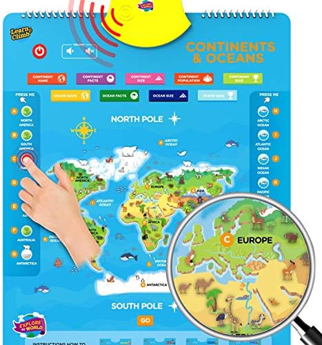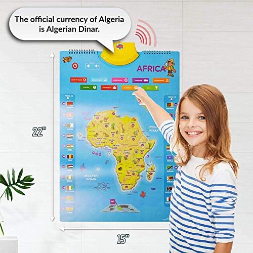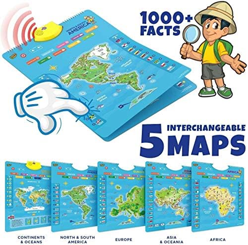 5 INTERCHANGEABLE MAPS – Your kids will love exploring and learning about the world around you with 5 interchangeable maps of the 5 major continents (North and South America, Europe, Africa and Asia). Your child will learn over 1000 facts about countries, capitals, oceans, language and much more! 3 AAA batteries required and not included.