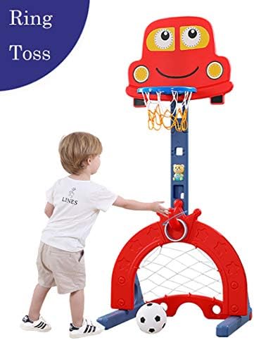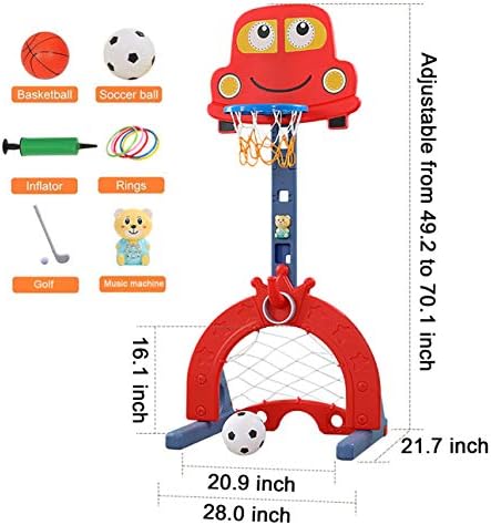 【5-IN-1 Activity Toys】This basketball hoop is multifunctional. It has four sports to play: basketball, soccer ring toss game and golf. Besides, there is a bear-shape music machine that increase children’s enjoyment. The package includes a 5-in-1 sports toy set, a basketball, a soccer ball, four rings, a golf club, a ocean ball as the golf, a inflator and a user’s manual.