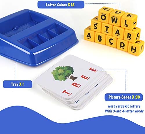 Package Include: The matching alphabet game comes with a tray, 12 letter cubes, 30 picture cards (60 words (including 3 and 4 letters) words).