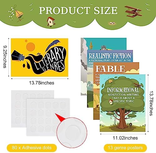 Easy to Use: educational literary genres classroom decorations come with 80 pieces adhesive dots, these adhesive dots will help you stick the literary genres poster set wherever you want, bright literary genres poster set will provide a better visual experience