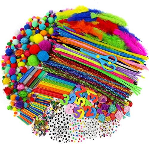 ENORMOUS ASSORTMENT: Materials included are 150 pipe cleaners, 50 metallic pipe cleaners, 245 assorted size pom poms, 5 jumbo (2 inch) pompoms, 95 glitter pom poms, 4 glitter glue pens, 1 safety scissor, 200 adhesive googly eyes (in assorted colors and sizes), 30 wooden colorful craft popsicle sticks, 100 craft matchsticks, ~70 foam letter & number stickers, ~30 glitter foam sticker shapes, 50~ colorful craft feathers, and ~1000 sequins/spangles. (~ Approx quantity. Packed by weight.)